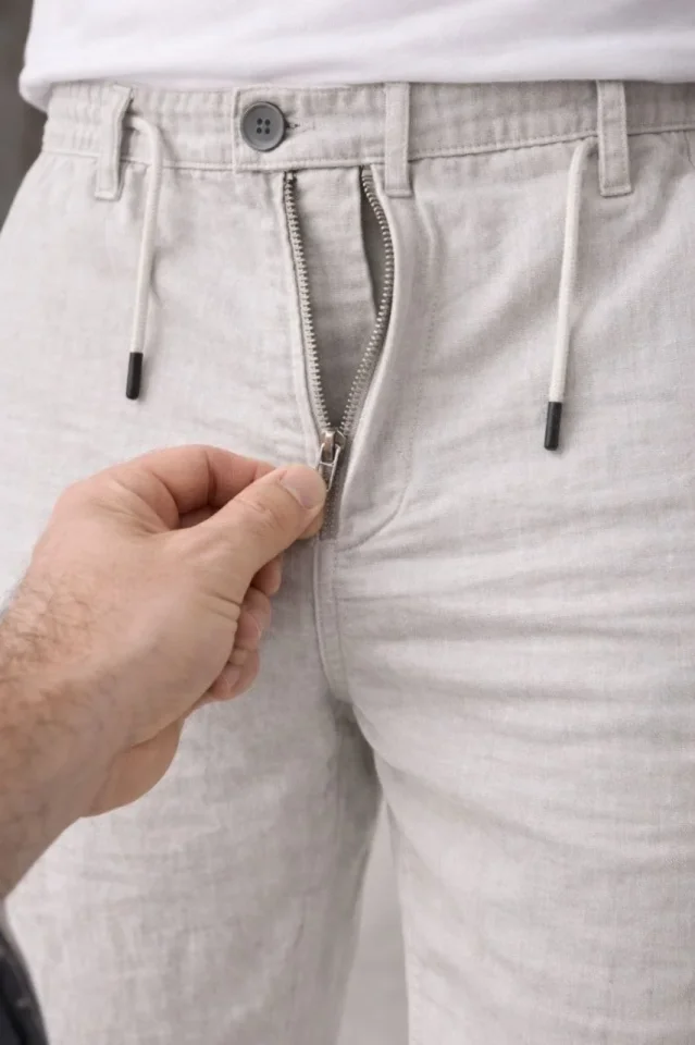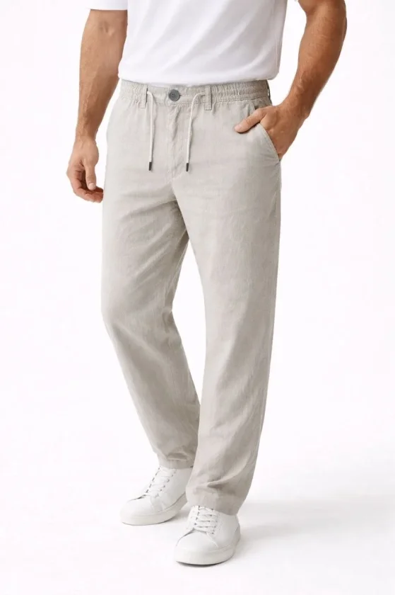 Erkek Keten Cepli Pantolon Lastikli Bel Bağcıklı Önden Fermuarlı – Krem