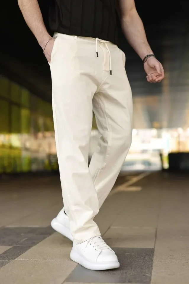 Erkek Keten Cepli Pantolon Lastikli Bel Bağcıklı Önden Fermuarlı – Krem