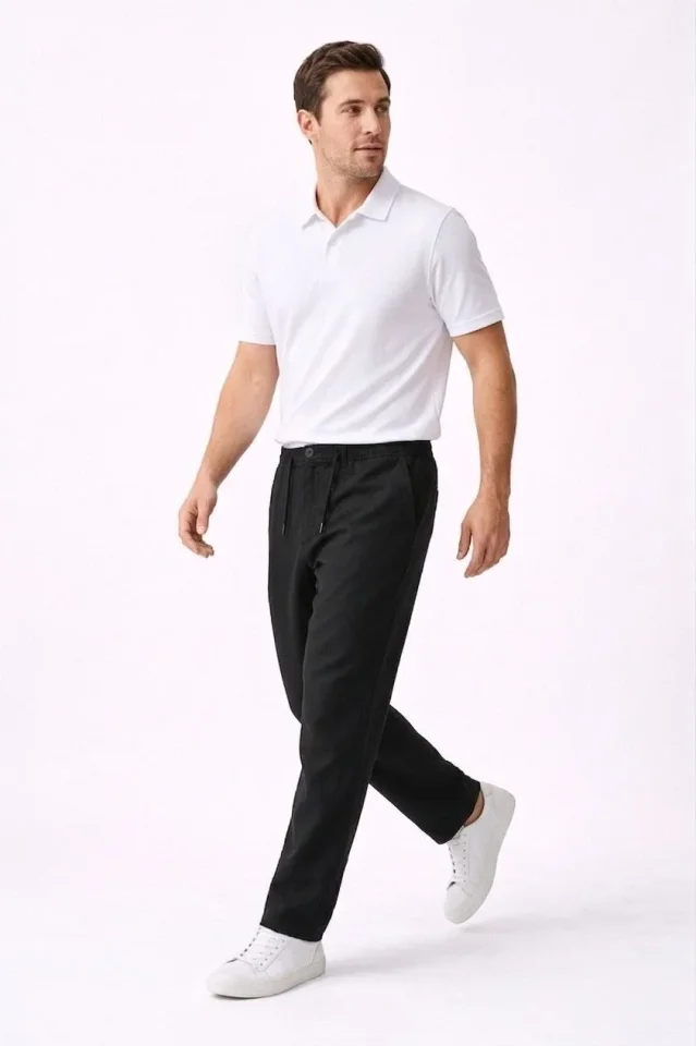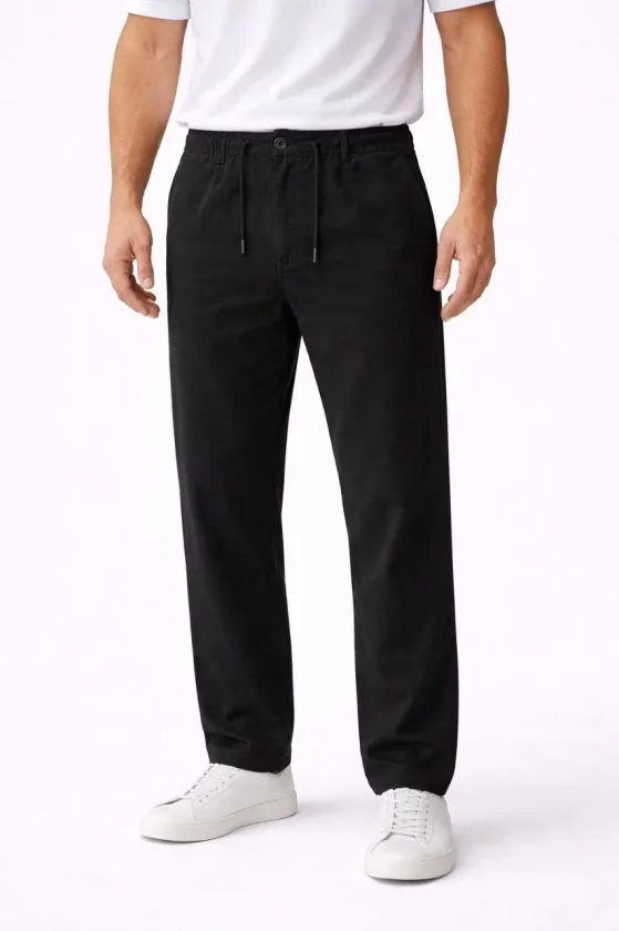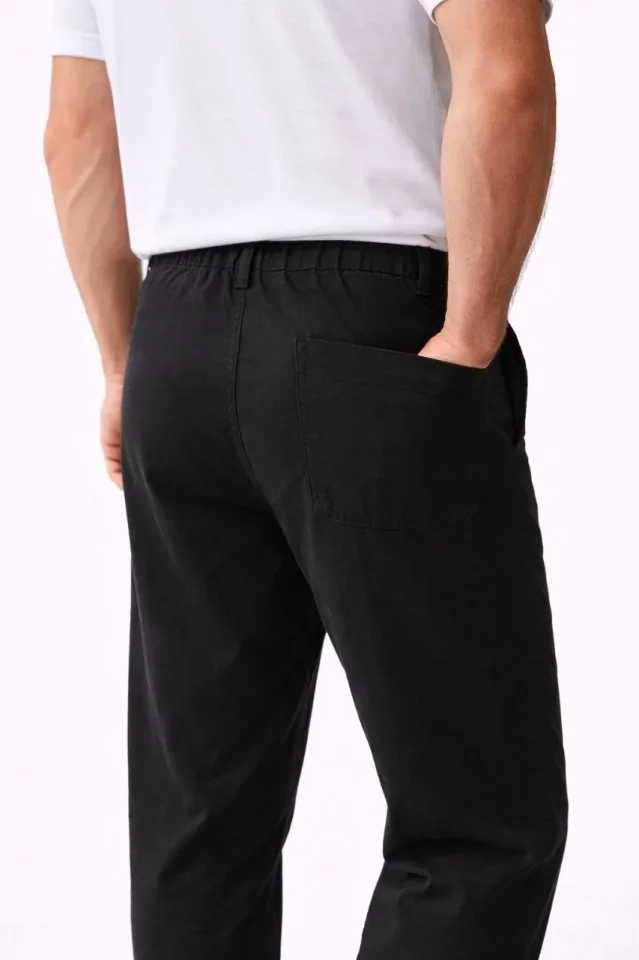 Erkek Keten Cepli Pantolon Lastikli Bel Bağcıklı Önden Fermuarlı – Siyah
