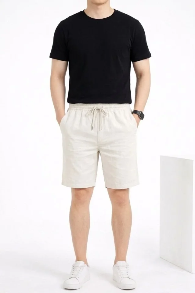 Erkek Keten Kumaş Cepli Rahat Kesim Bel Lastikli Şort – Krem