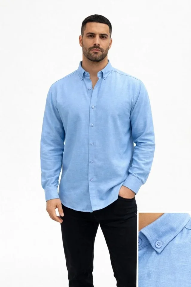 Erkek KETEN Kumaş Oversize Uzun Kollu Rahat Kalıp Gömlek – Saks Mavisi