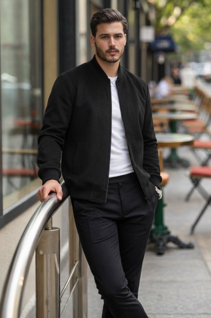 Tam Fermuarlı Uzun Kol Baskılı Bomber Ceket – Siyah