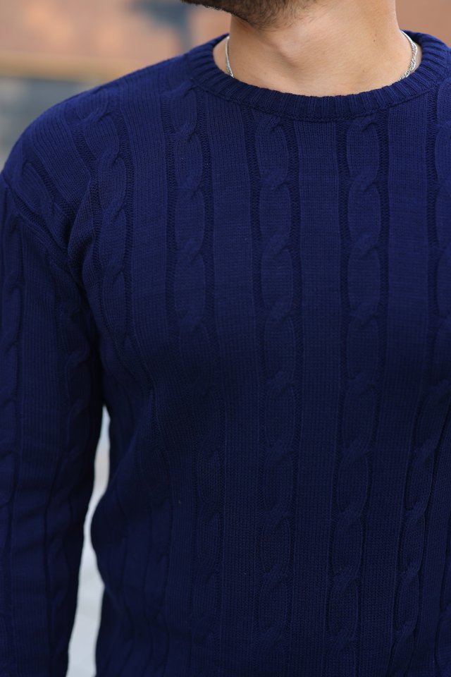 Erkek Balıkcı Yaka Bağazlı Triko Kazak Pamuklu Kalın Fitilli Dokuma, Regular Fit Uzun Kollu Kışlık Model – Lacivert