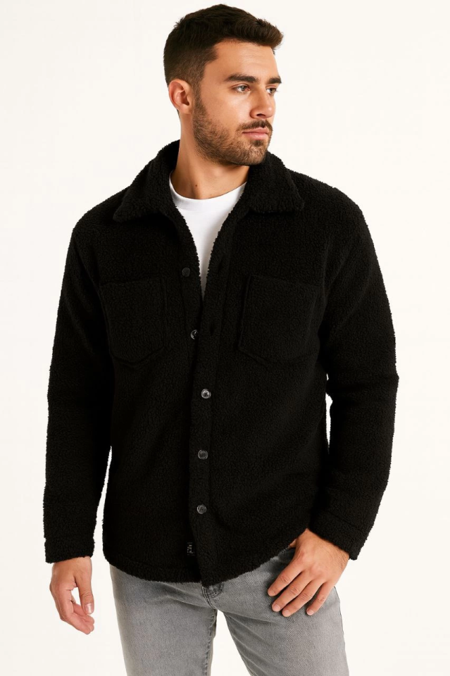 Erkek Pelüş Polar Hırka Gömlek – Yakalı, İlik Düğmeli, Göğüs Cepli, Yumuşak Dokulu Kışlık Regular Fit Rahat Günlük Model – Siyah