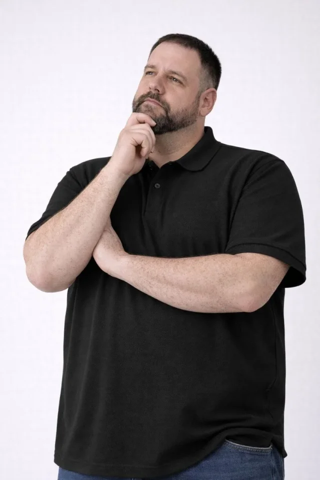 Erkek Pike Kumaş Düğmeli Yaka Battal Büyük Beden Günlük Kısa Kol Tişört T-shirt – Siyah