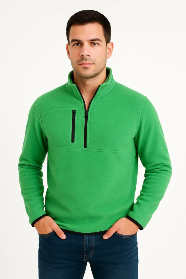 Erkek Polar Kazak – Dik Yaka, Yarım Fermuarlı, Fermuarlı Göğüs Cepli, Siyah Biyeli, Kışlık Rahat Regular Fit Günlük Model – Yeşil