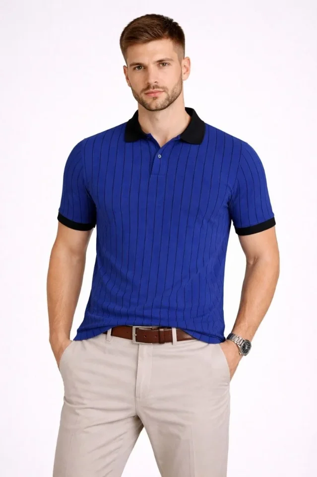 Erkek Polo Yaka Çizgili Tişört Kısa Kol Düğmeli Yazlık T-Shirt – Saks Mavisi
