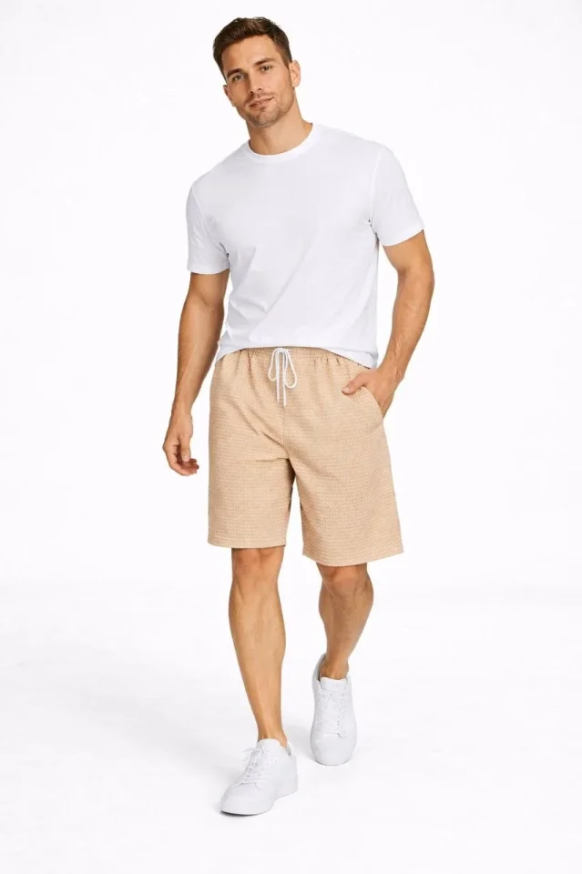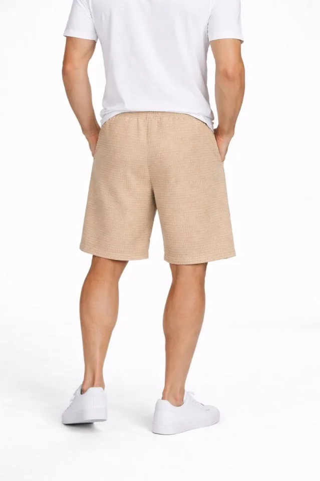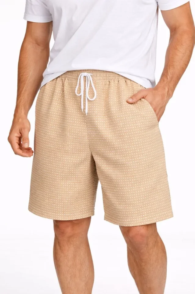 Erkek Pötikareli Şort – Beli Lastikli Bağcıklı, Cepli, Rahat Kesim Günlük Yazlık Şort – Bej