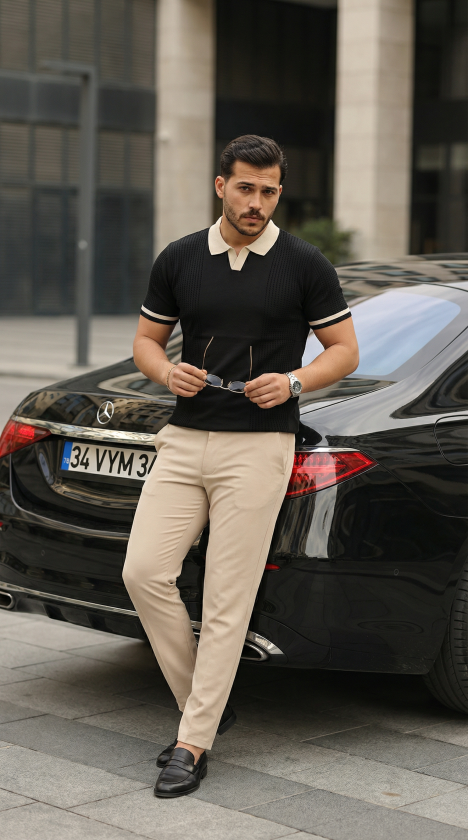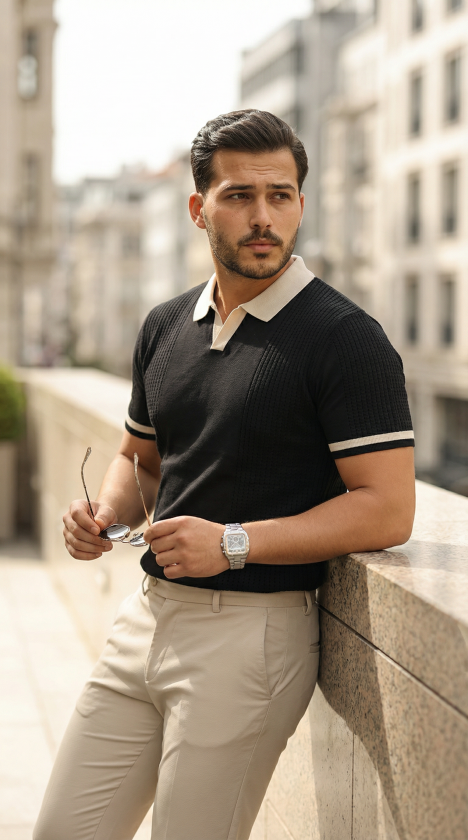Erkek Desenli Kısa Kollu Triko Tişört – %100 Pamuk Akrilik