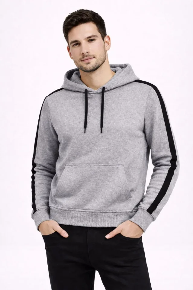 Erkek Şeritli Kapüşonlu Sweatshirt Oversize 3 Iplik Pamuklu – Gri