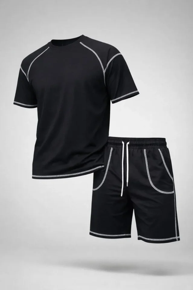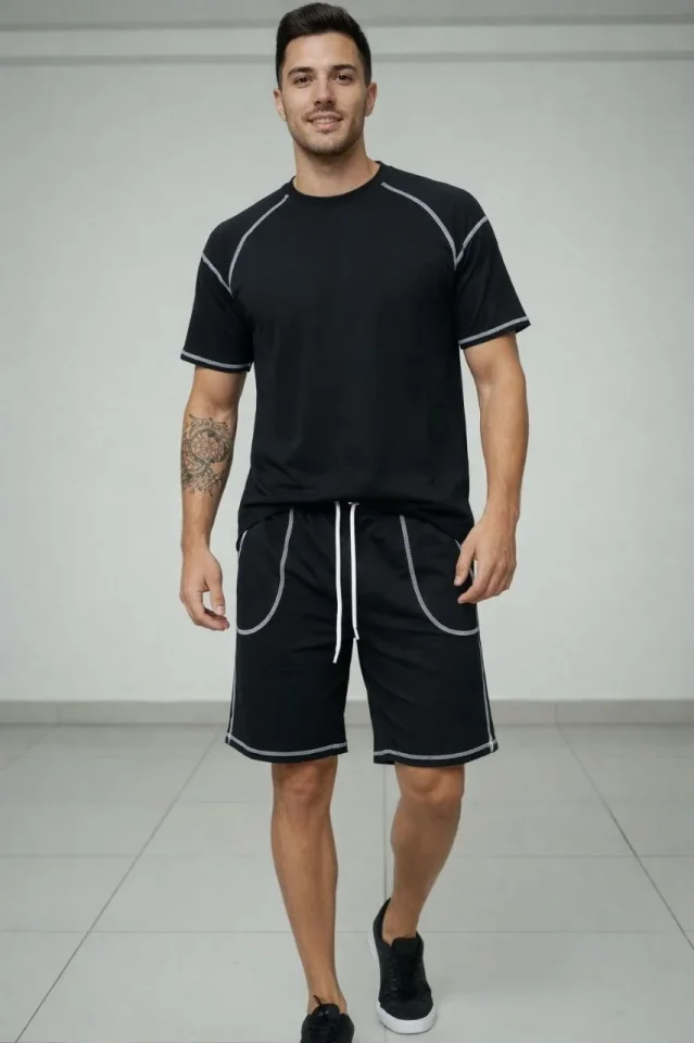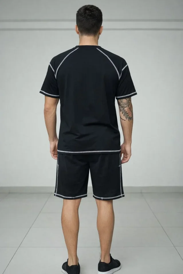Erkek Spor Tişört Şort Takım Kontrast Dikiş Detaylı Ovarsize Rahat Kalıp – Siyah