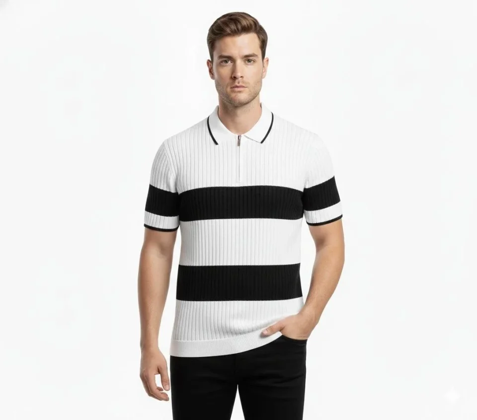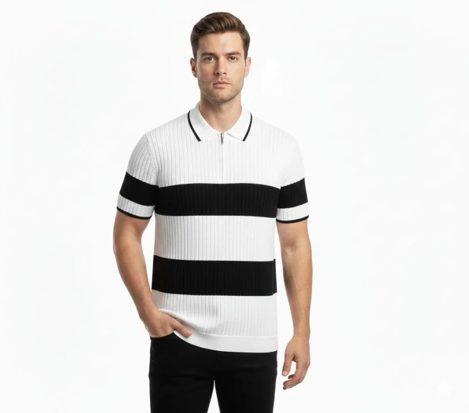 Erkek T-shirt Çizgili Triko Dokuma Kumaş Polo Yaka Yarım Fermuarlı Regular Kalıp Tişört – Beyaz