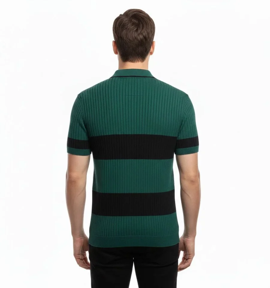 Erkek T-shirt Çizgili Triko Dokuma Kumaş Polo Yaka Yarım Fermuarlı Regular Kalıp Tişört – Çağla Yeşili