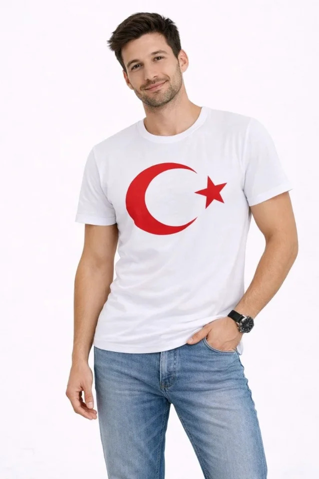 Erkek T-Shirt Kısa Kol Bisiklet Yaka Ay Yıldız Bayrak Baskılı Tişört – Beyaz
