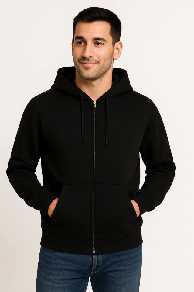Erkek Üç İplik Kapüşonlu Tam Fermuarlı Kanguru Çepli SweatShirt Hoodie – Siyah