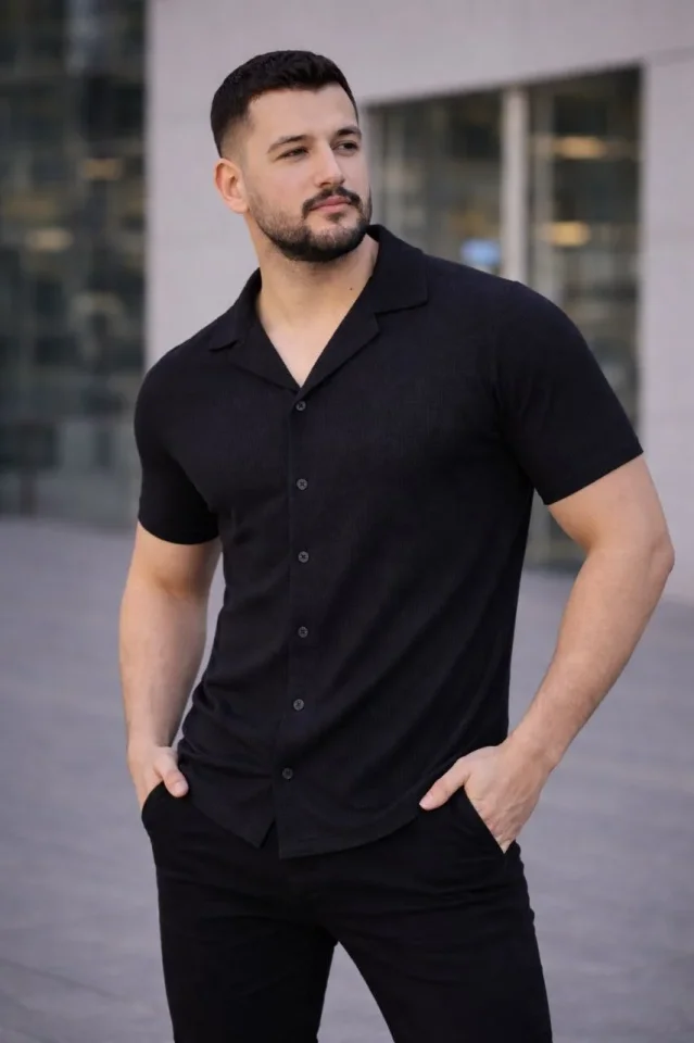 Erkek Waffle Kumaş Kısa Kollu Düğmeli Açık Yaka Regular Fit Gömlek – Siyah