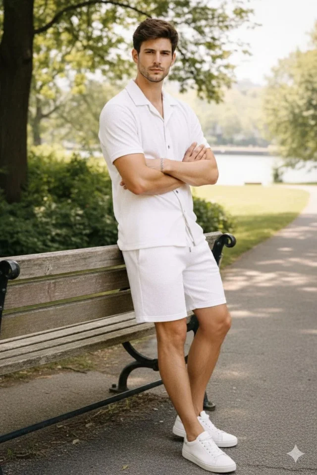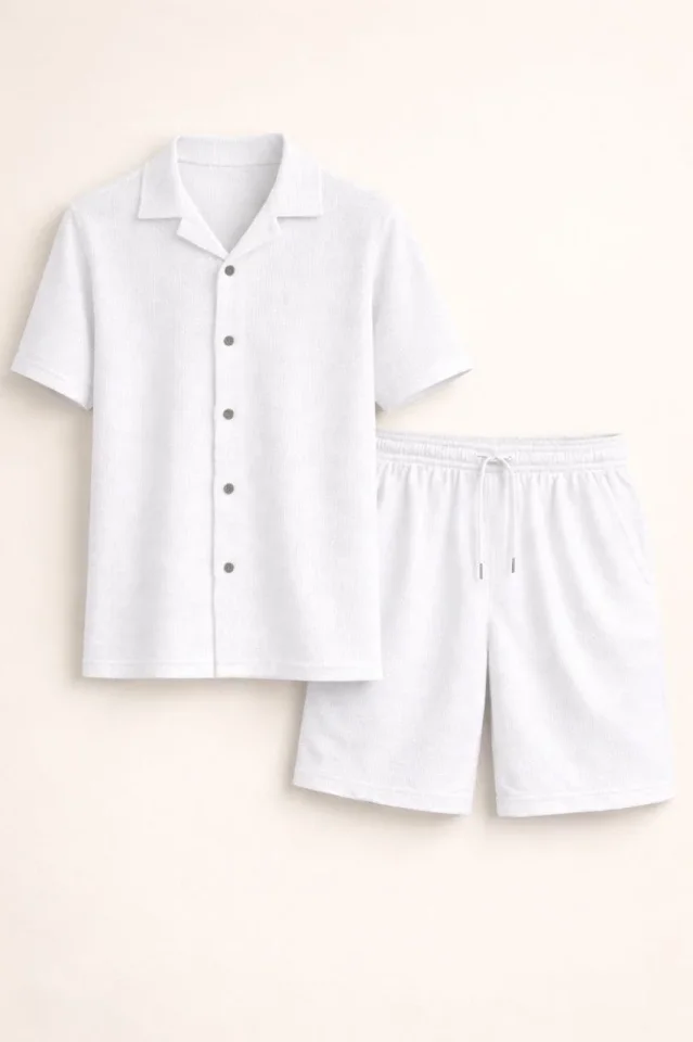 Erkek Waffle Kumaş Kısa Kollu Gömlek Şort Takım Regular Fit Yazlık İkili Set – Beyaz
