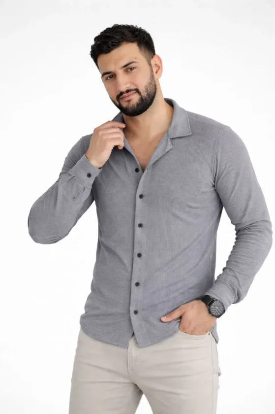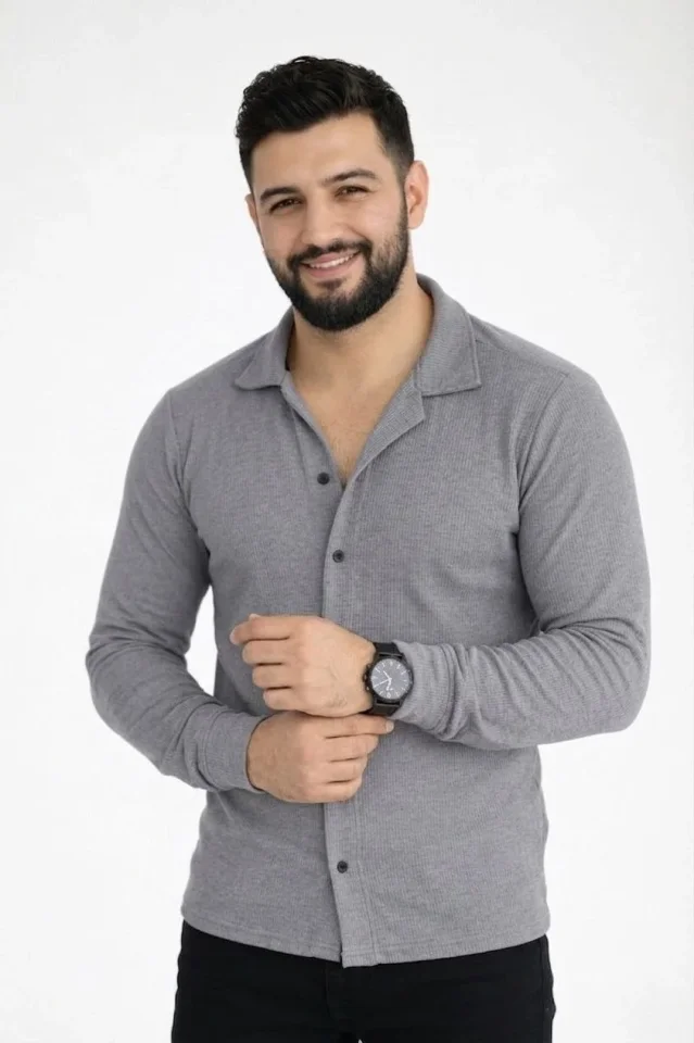 Erkek Waffle Kumaş Uzun Kollu Düğmeli Açık Yaka Regular Fit Gömlek – Füme
