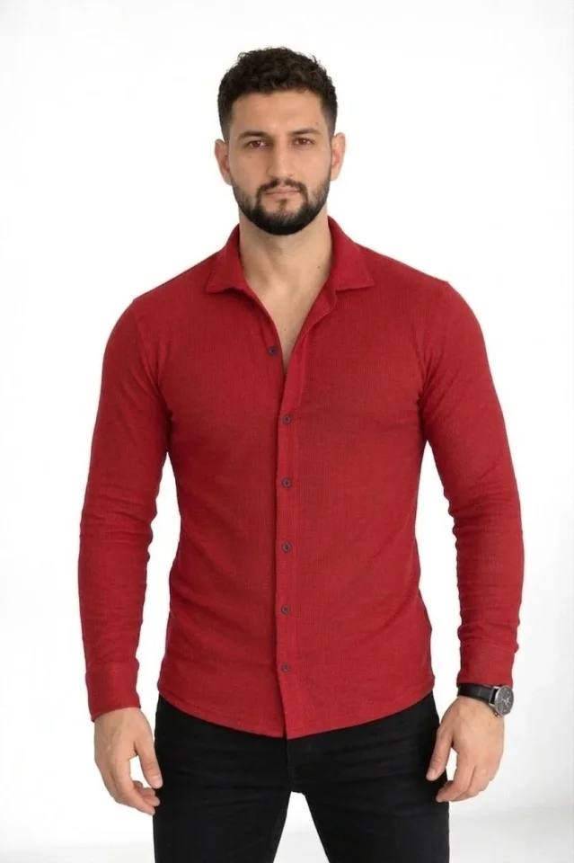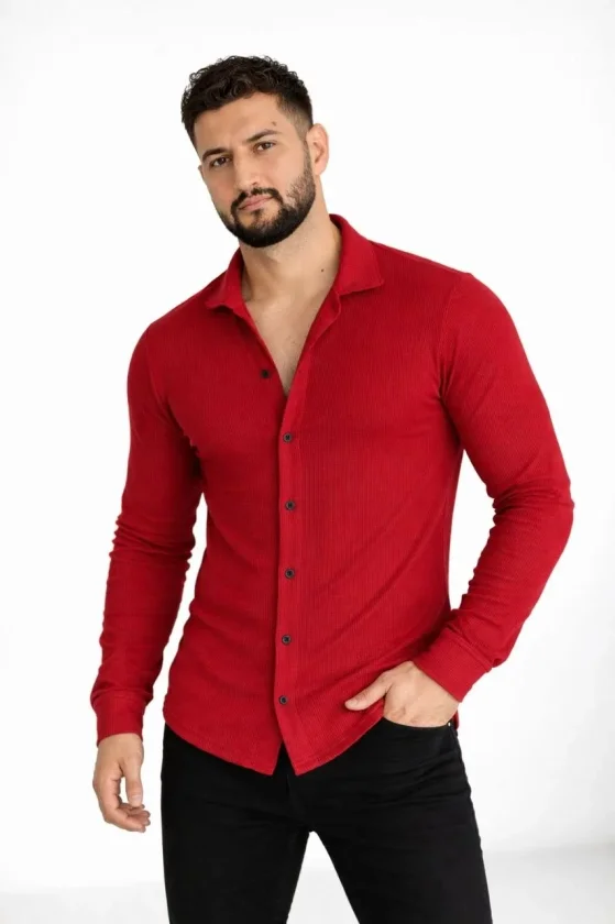Erkek Waffle Kumaş Uzun Kollu Düğmeli Açık Yaka Regular Fit Gömlek – Kırmızı