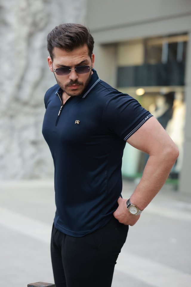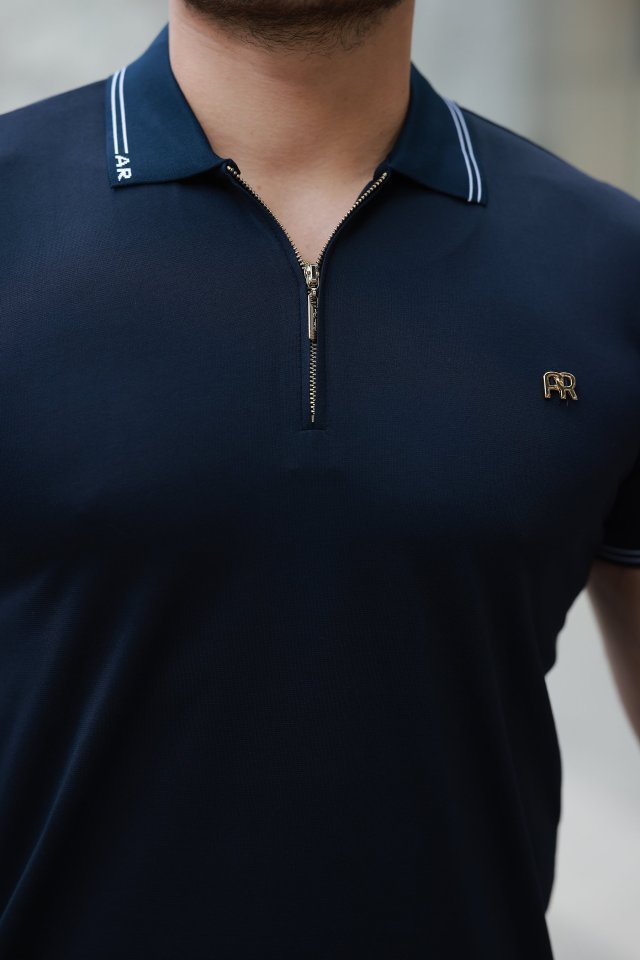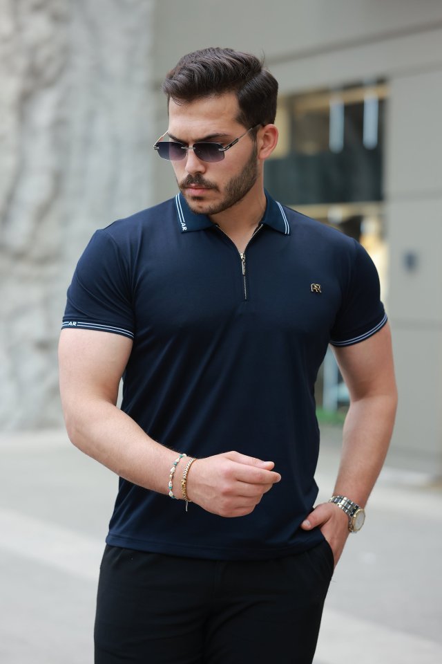 Erkek Yaka Ve Kolları çizgi Detaylı Fermuar Yakalı Kısa Kollu Tişört