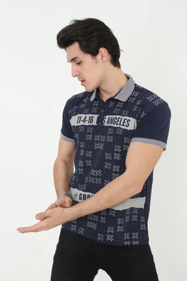 Erkek Yakalı Slim Fit Baskılı T-Shirt – Lacivert