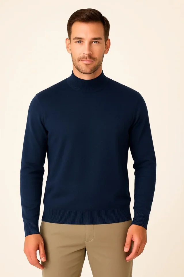 Erkek Yarım Boğaz Triko Kazak Yumuşak Dokulu Pamuklu Ince Dokuma, Uzun Kollu Rahat Regular Kalıp – Lacivert