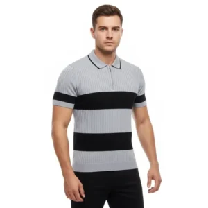 Erkek T-shirt Çizgili Triko Dokuma Kumaş Polo Yaka Yarım Fermuarlı Regular Kalıp Tişört – Gri