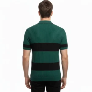 Erkek T-shirt Çizgili Triko Dokuma Kumaş Polo Yaka Yarım Fermuarlı Regular Kalıp Tişört – Çağla Yeşili