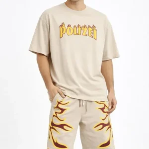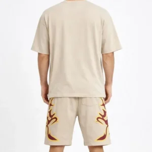 Erkek Bej Oversize Baskılı Tişört Şort Takım Cepli Şort Yazlık Rahat Günlük Kombin – Bej