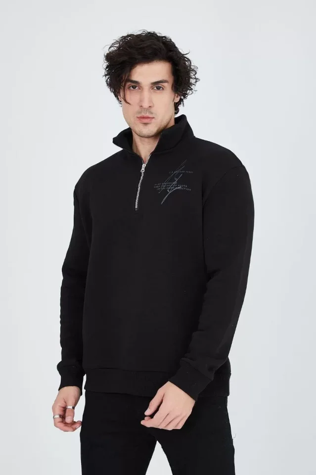 Erkek Yarım Fermuarlı Baskılı Sweat – Siyah
