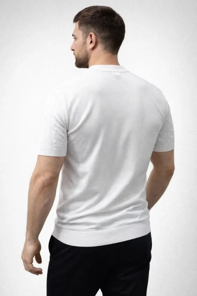 Erkek Yazlık Triko Dokuma Tişört Kısa Kol Bisiklet Yaka Örgü Desenli T-Shirt – Beyaz