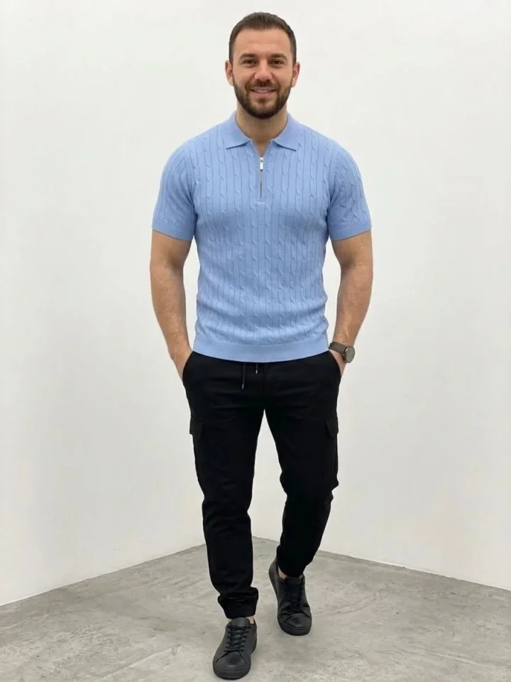 Erkek Yazlık Triko Saç Örgü Tişört Kısa Kol Polo Yaka Fermuarlı T-Shirt – Bebe Mavisi