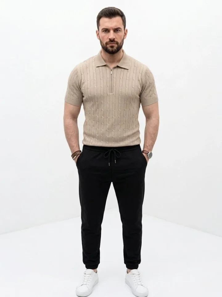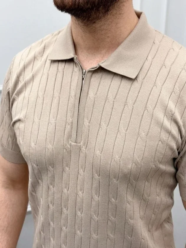 Erkek Yazlık Triko Saç Örgü Tişört Kısa Kol Polo Yaka Fermuarlı T-Shirt – Bej