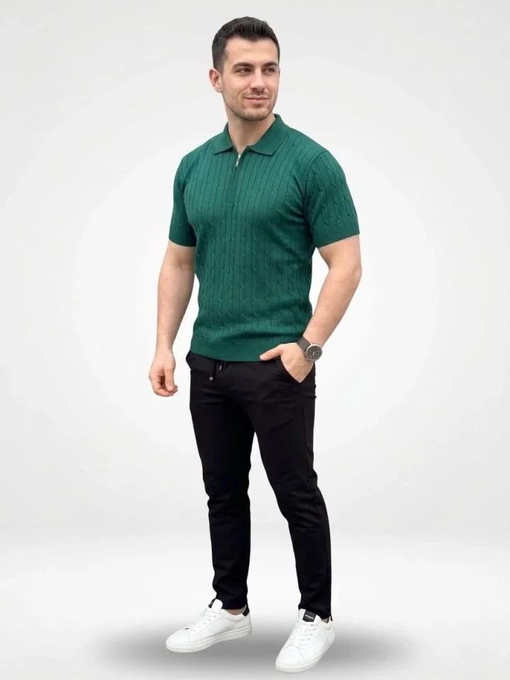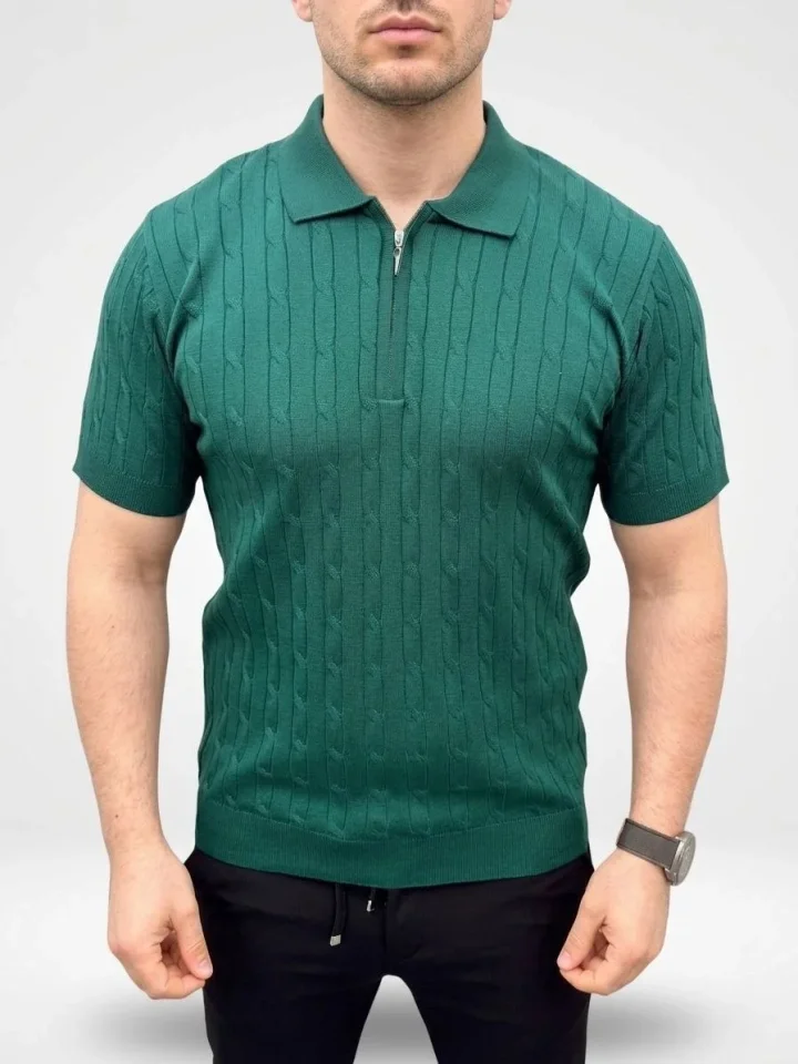 Erkek Yazlık Triko Saç Örgü Tişört Kısa Kol Polo Yaka Fermuarlı T-Shirt – Haki