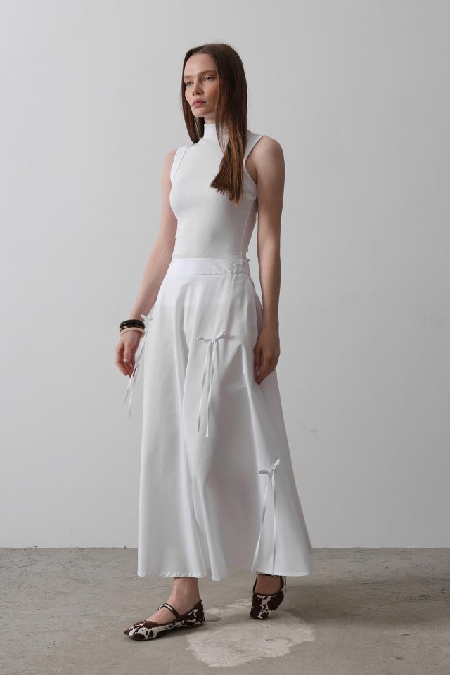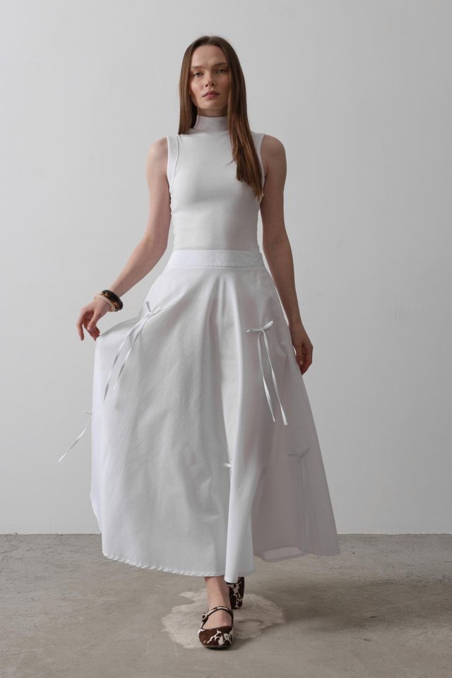 Fiyonk Kloş Etek – Beyaz Modelin Ölçüleri: Boy:165, Kg:55, Göğüs:90, Bel:72, Kalça: 100 Modelin üzerindeki ürün M/38 bedendir
