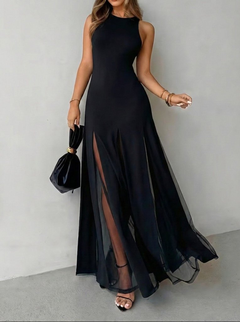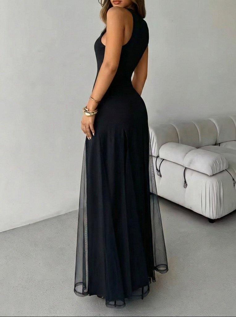 Kadın Askılı Bisiklet Yaka Etek Ucu Tül Detaylı Asimetrik Kiloş Uzun Ithal Krep Elbise