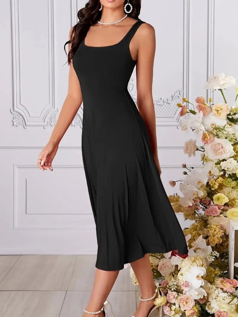 Kadın Askılı Geometrik Yakalı Geniş Kesim Detaylı Ithal Krep Elbise