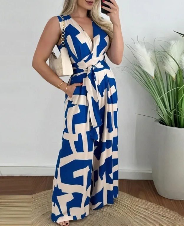 Kadın Askılı Kruvaze Yakalı Belden Kuşaklı Uzun Desenli Süprem Tulum
