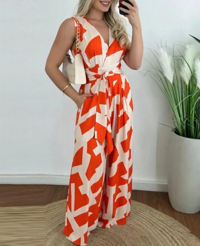 Kadın Askılı Kruvaze Yakalı Belden Kuşaklı Uzun Desenli Süprem Tulum