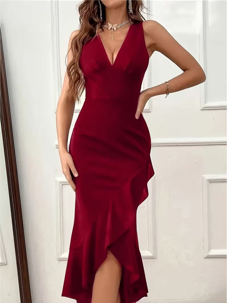 Kadın Askılı Geniş V Yakalı Sırttan Bağlamalı Yırtmaçlı Süprem Elbise