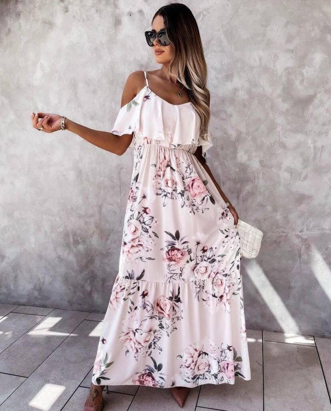 Kadın Gül Desenli Maxi Boy Mikro Kumaş Elbise Modelin Ölçüleri: Boy:165, Kg:55, Göğüs:90, Bel:72, Kalça: 100 Modelin üzerindeki ürün M/38 bedendir