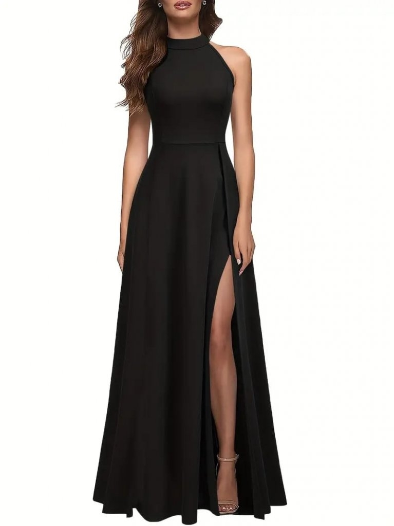 Kadın Halter Yaka Derin Yırtmaç Detaylı Tam Boy Ithal Krep Abiye Elbise