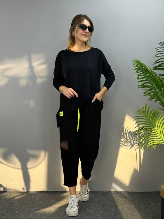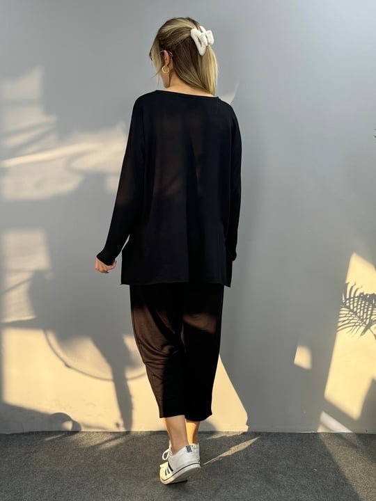 Kadın Iki Iplik Viskon Pamuk Kumaş Arma Detaylı Ikili Takım Modelin Ölçüleri: Boy:165, Kg:55, Göğüs:90, Bel:72, Kalça: 100 Modelin üzerindeki ürün M/38 bedendir KOL UZUNLUK-Uzun KolTAKIM OZELLIK-Pantolonlu Takım