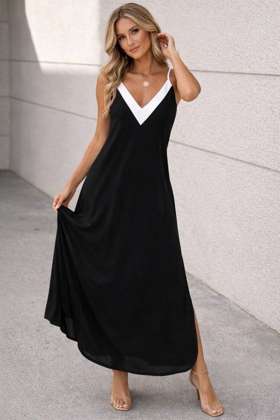 Kadın Ip Askılı Keskin V Yakalı Uzun Viskon Elbise