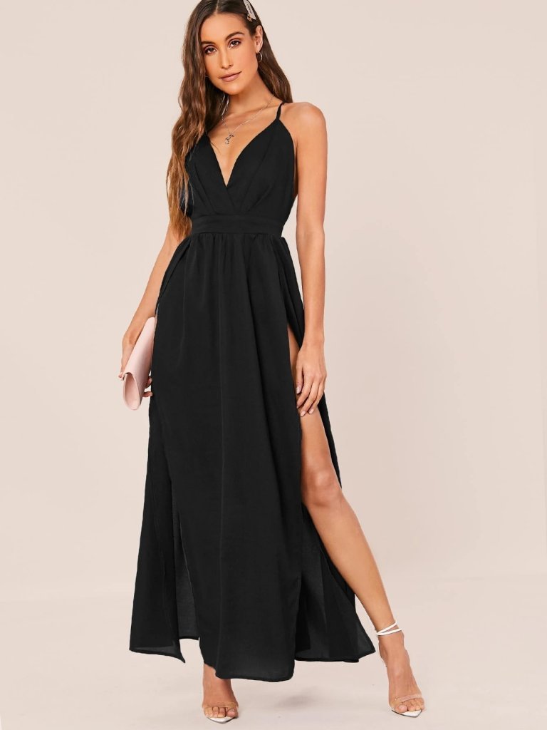 Kadın Ip Askılı Kruvazeli Yırtmaç Detaylı Yerli Krep Uzun Elbise