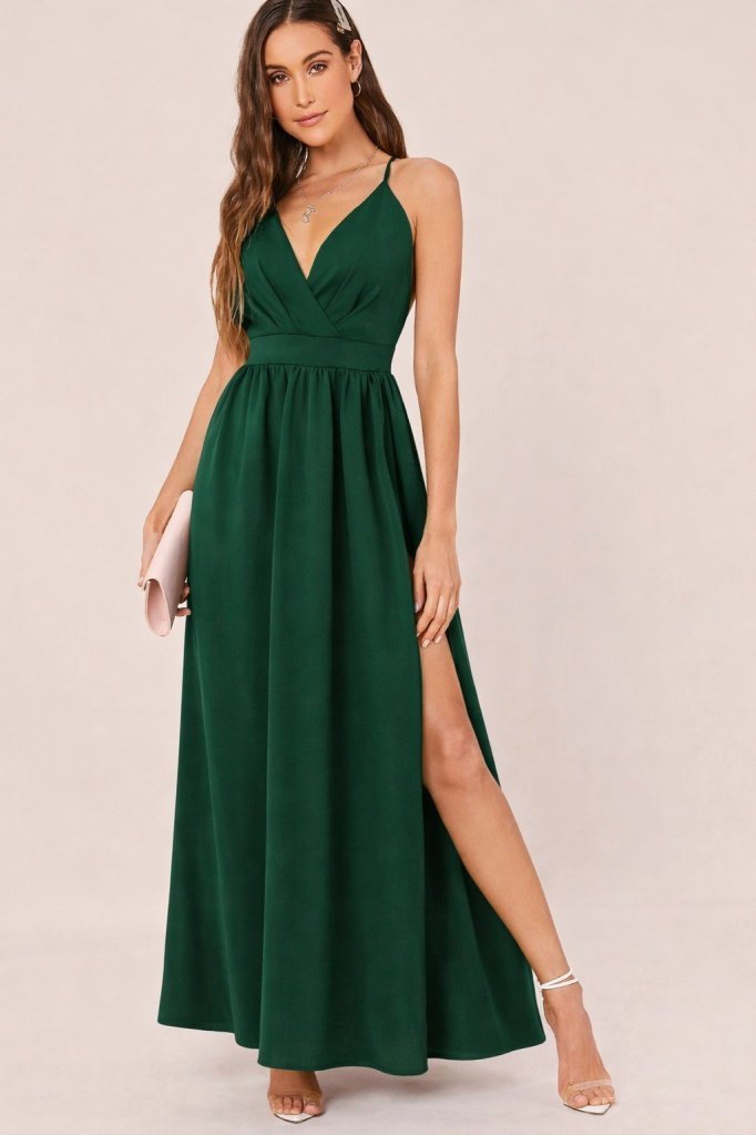 Kadın Ip Askılı Kruvazeli Yırtmaç Detaylı Yerli Krep Uzun Elbise