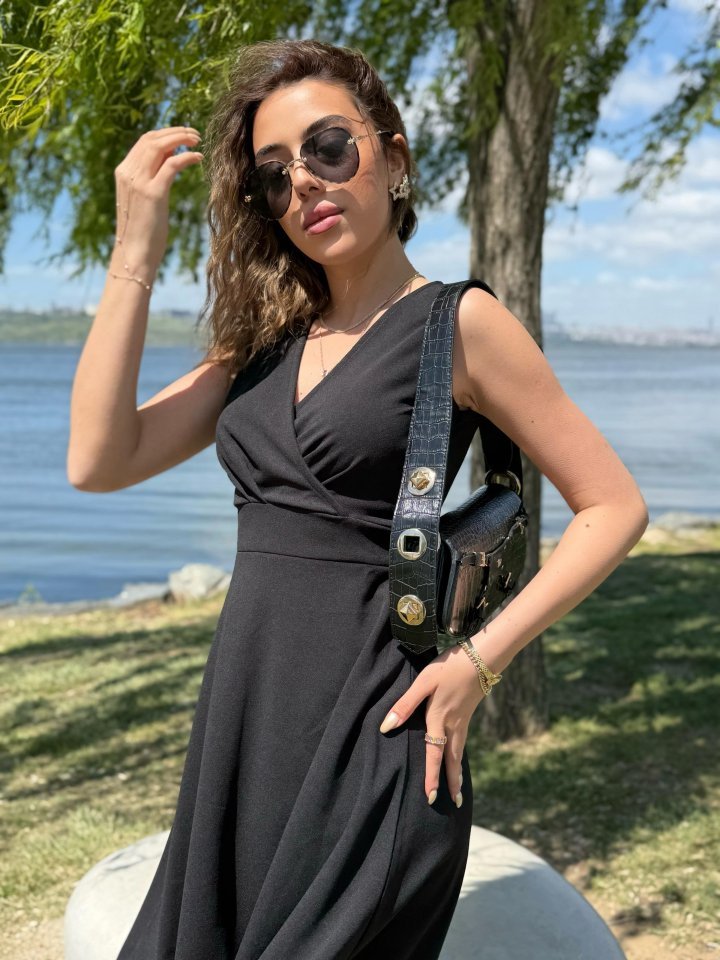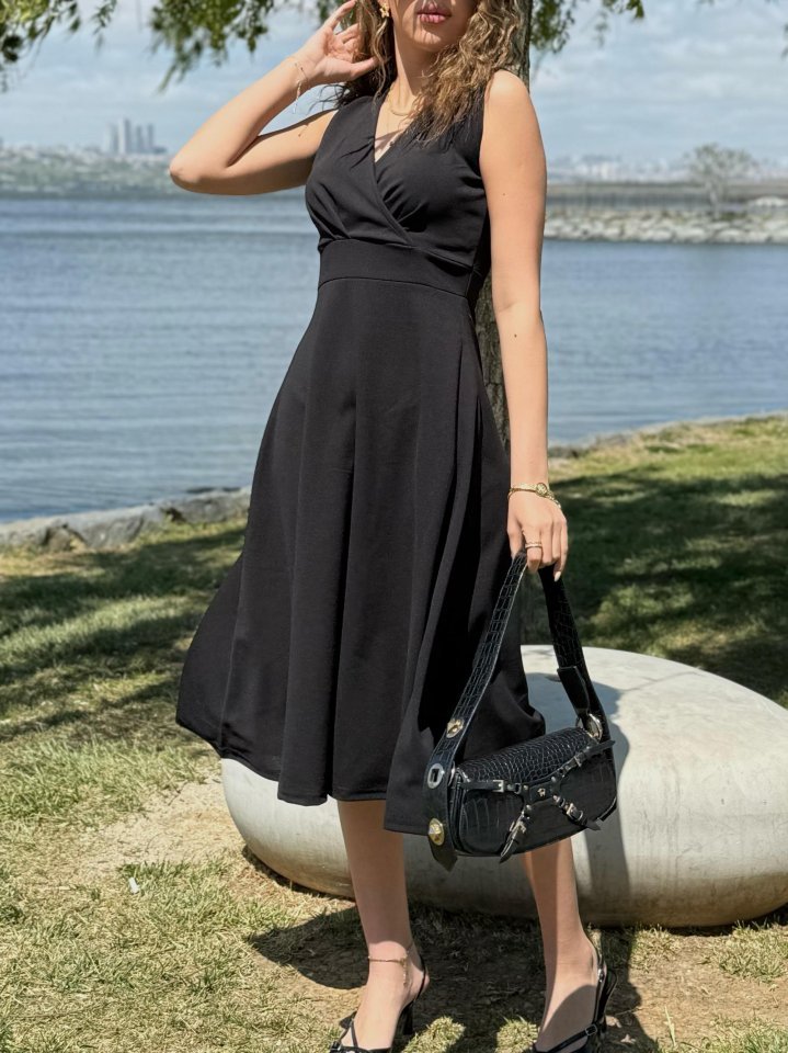 Kadın Ithal Krep Kumaş Kruvaze Yaka Eteği Kloş Kolsuz Mini Elbise