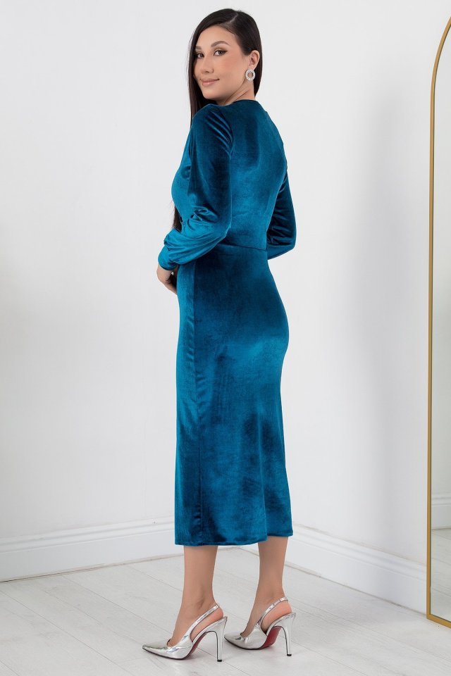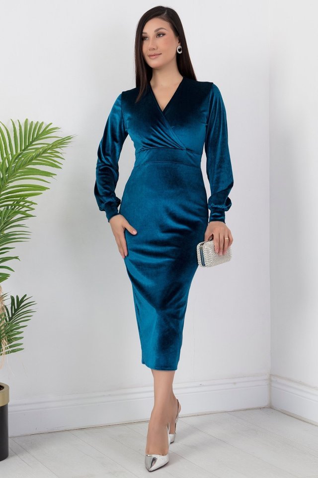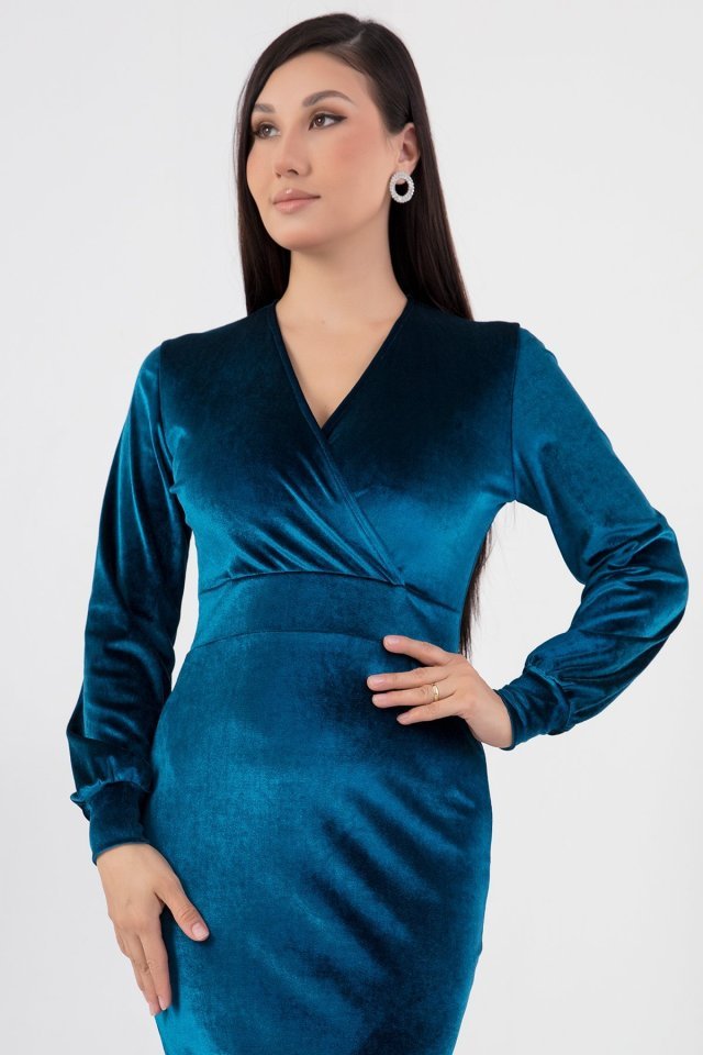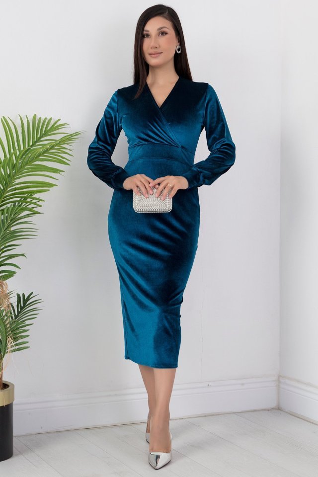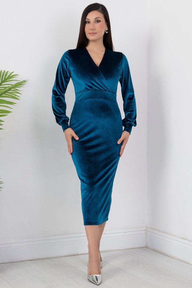 Kadın Kadife Kumaş Manşetli V Yaka Şık Kalem Elbise