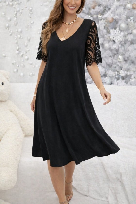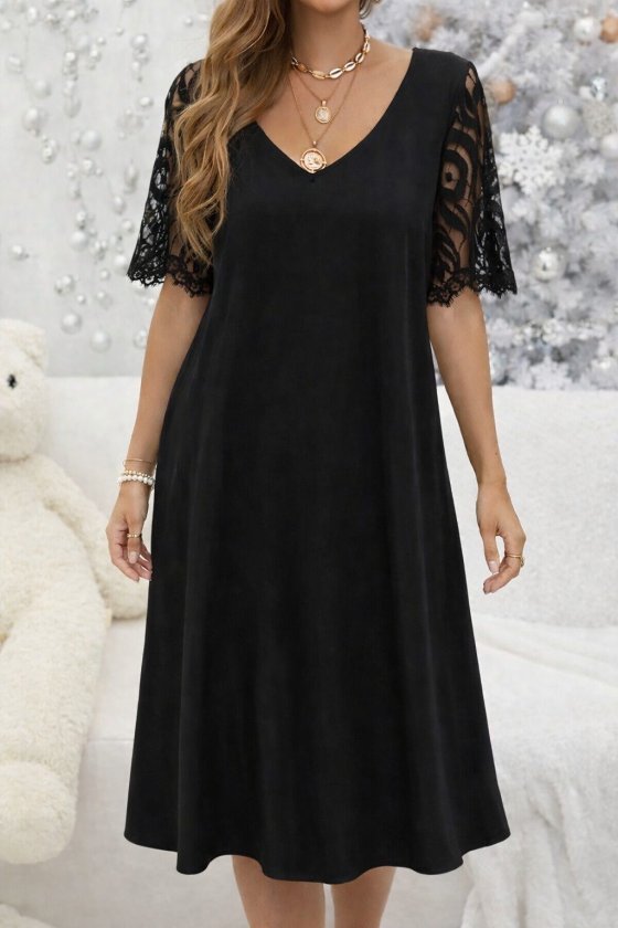 Kadın Kısa Dantel Kollu V Yakalı Midi Viskon Elbise