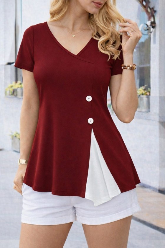 Kadın Kısa Kollu Asimetrik V Yakalı Düğme Detaylı Viskon Bluz